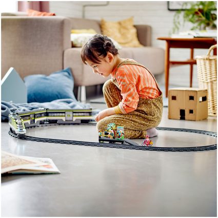 - Inneholder et lyntog-lokomotiv med fungerende, dimbare lys, restaurantvogn, passasjervogn og perrong, samt 24 skinneelementer og seks minifigurer