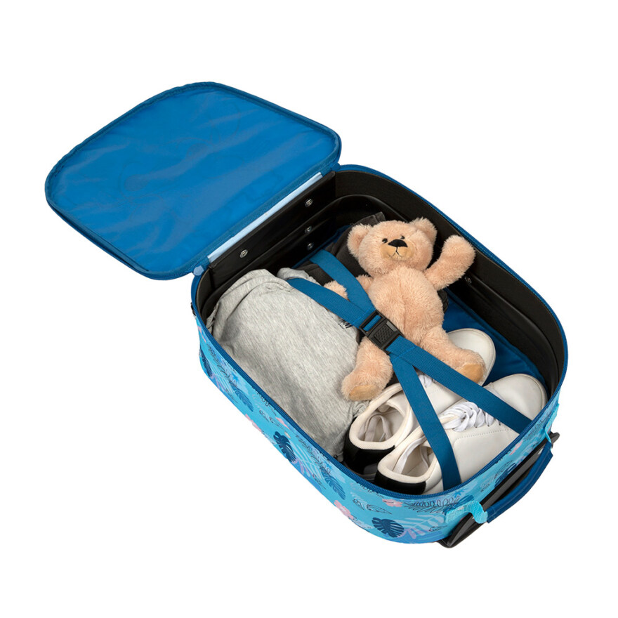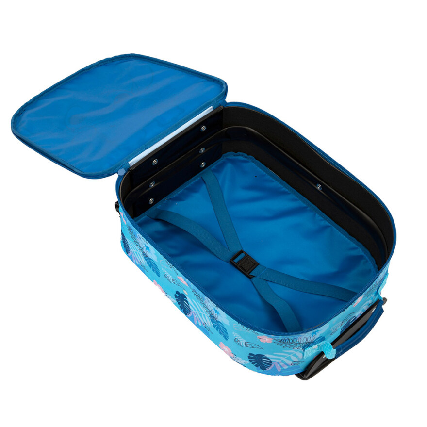 Lilo & Stitch barnekoffert er en morsom og funksjonell koffert for små reisende. Med et stort hovedrom, toveis glidelås og dekorativt drahåndtak, er den enkel å bruke og lett å kjenne igjen. Kofferten har justerbart og låsbart teleskophåndtak, bærehåndtak, to hjul og støtteben som gir god stabilitet. Innvendige elastiske stropper holder innholdet på plass, og navnefeltet gjør det enkelt å merke kofferten.