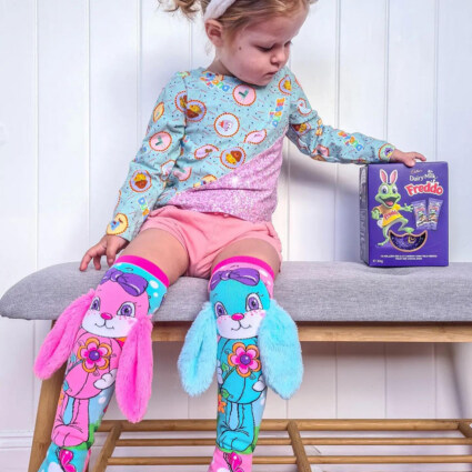 Hopp og sprett i disse søte Hunny Bunny-sokkene med myke kaninører! De pastellfargede sokkene er utrolig morsomme å ha på for enhver liten. Et par av disse fargerike kaninsokkene gir deg langvarig energi, et søtt utseende og kule føtter! Perfekte for sprø sokkedager, spesielle anledninger, bursdager, og for å legge til litt moro i hvert steg du tar.