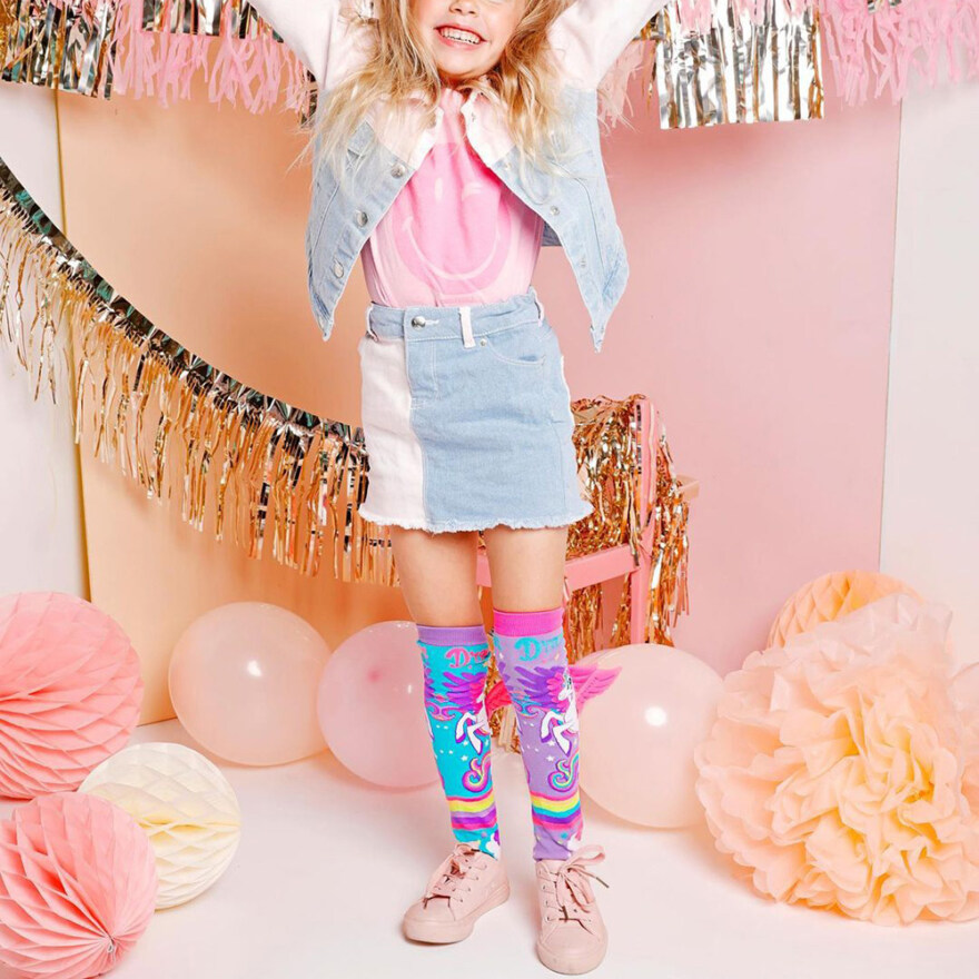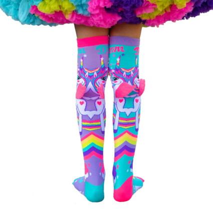 Opplev en verden full av farger og moro med disse unike enhjørningsokkene. Fly over regnbuen, forbi skyene og ut til stjernene med fantastiske enhjørninger. MADMIA Mini Pony-sokker blir raskt en favoritt blant barn (rosa vinger og masse kjærlighet inkludert).