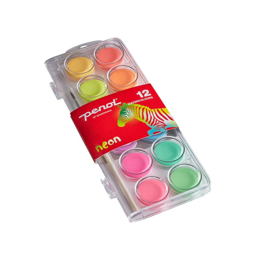 12 neon fargetabletter i skrin. Maleskrin fåes i flere størrelser og inneholder klare, dekkende vannfarger. Alle skrin inneholder pensel.
