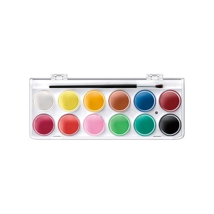 Maleskrin fåes i flere størrelser og inneholder klare, dekkende vannfarger. Alle skrin inneholder pensel. Meget høy kvalitet på fargetablettene. 12 farger.