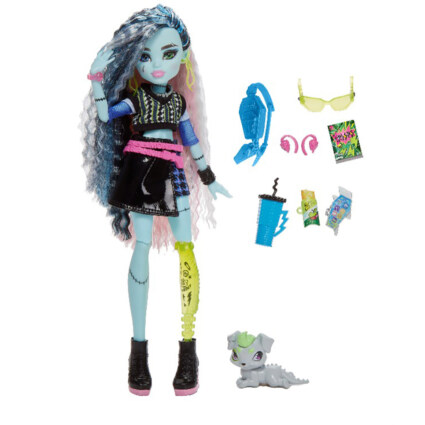 Denne Frankie Stein‑dukken har en uttrykksfull Monster High‑stil med et preppy antrekk som er inspirert av synåler og sting. Dukken kommer med flere små tilbehør som gjør leken mer variert, og den er fullt bevegelig slik at barn enkelt kan skape egne scener og historier. Den lille hundevalpen Watzie følger med og gir ekstra muligheter for fantasifull rollelek.