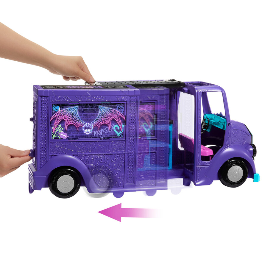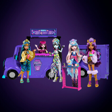 Gjør deg klar for den ultimate festivalopplevelsen med Monster High Monster Fest Transforming Food Truck + Doll Playset! Denne 2-i-1-lekeopplevelsen kombinerer matservering og musikkfest i ett. Food trucken har rullende hjul, kjøkken med frityrgryte, og en uttrekkbar scene for konsertstemning. Med over 13 tilbehør og Draculaura i et festklart antrekk, kan barna lage skrekkelig morsomme historier – fra matlaging til rockekonsert. Perfekt for barn fra 4 år og oppover.