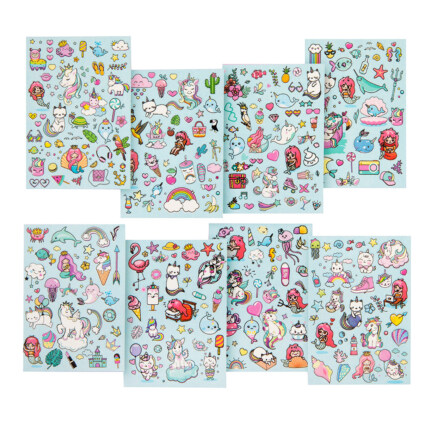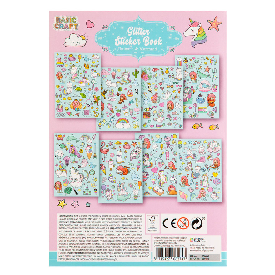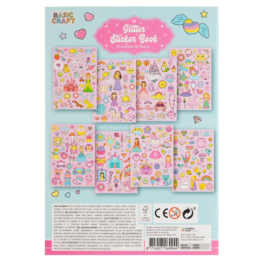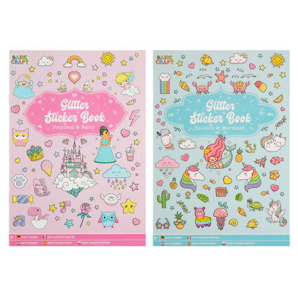 8 sider spekket med flotte glitterklistremerker. Velg mellom to ulike tema: Enhjørning og Havfrue eller Prisesse og Fe.