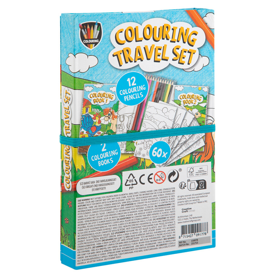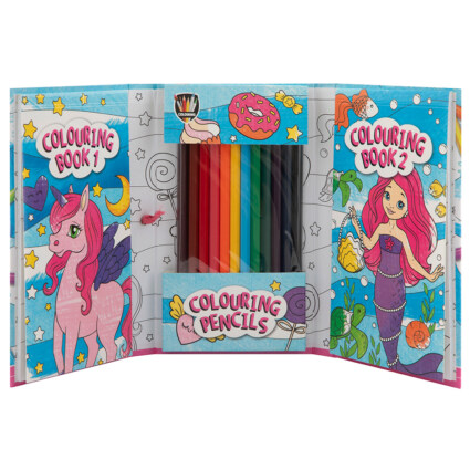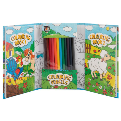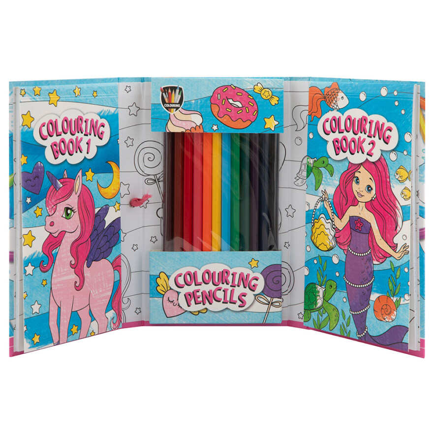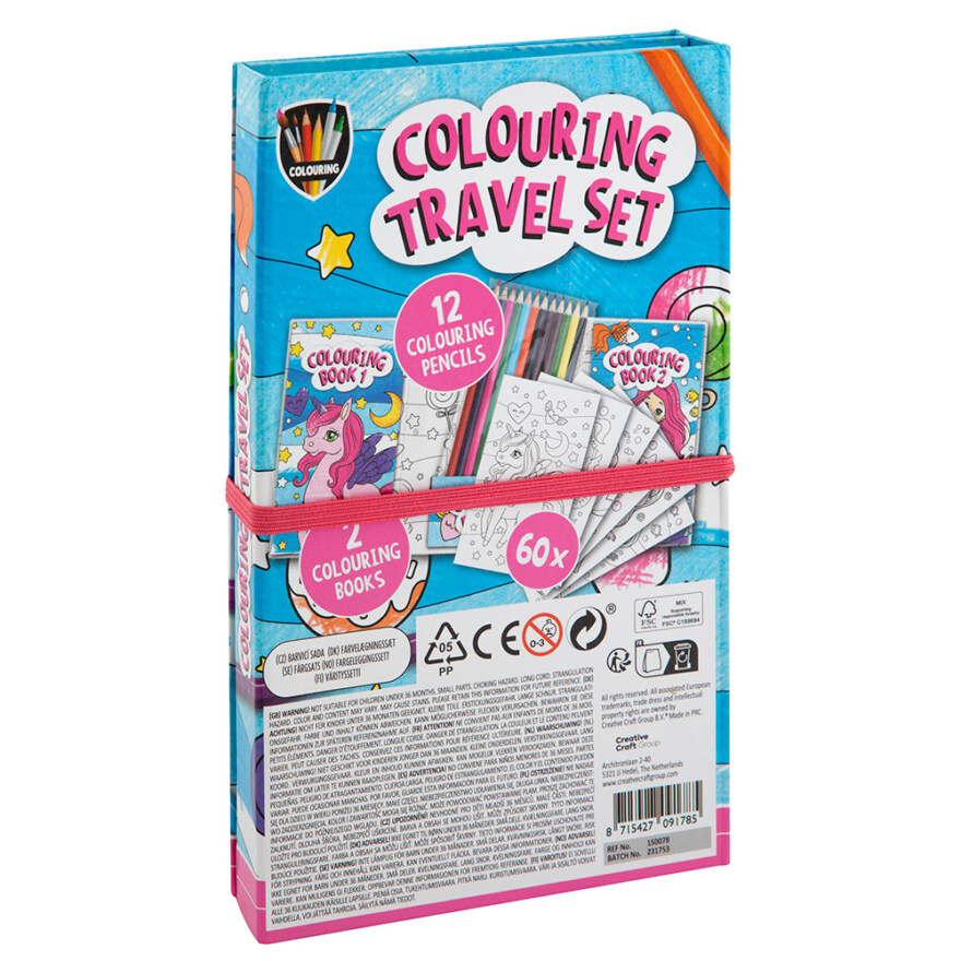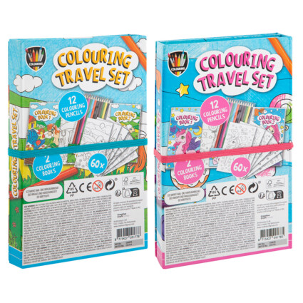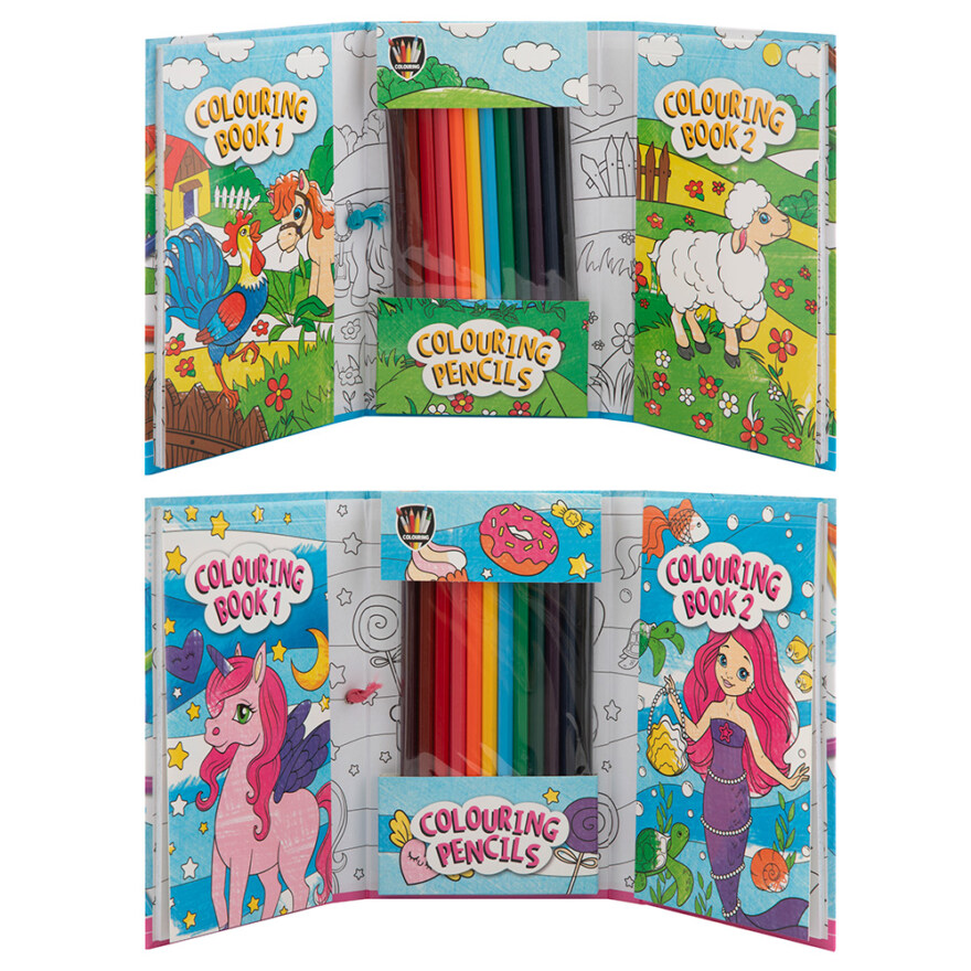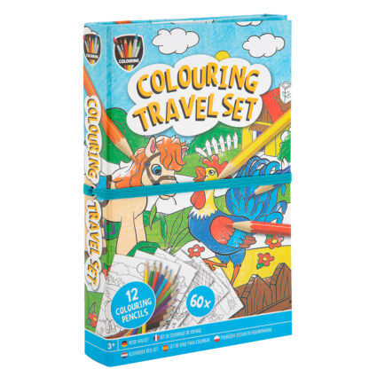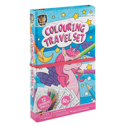 Sett med 2 små fargebøker og 12 store fargeblyanter i et praktisk reisesett. Med 60 fargeleggingssider med bilder av husdyr eller enhjørning.