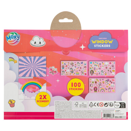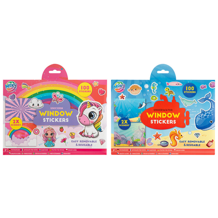 Sett med mer enn 100 gjenbrukbare vindusklistremerker. Inkludert 2 selvklebende bakgrunner. Velg mellom to ulike stiler: enhjørnings- og undervannstema.