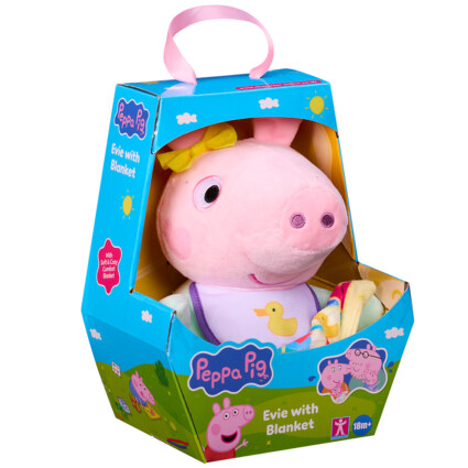 Denne koselige plysjversjonen av Peppas lillesøster Evie kommer med et mykt og trygt koseteppe som gjør henne ekstra god å holde rundt. Evie er supersoft, perfekt for kveldsro, kos og rollelek med Peppa‑universet. Hun leveres i en flott vuggeformet gaveeske som gjør henne til en ideell gave for små Peppa‑fans.