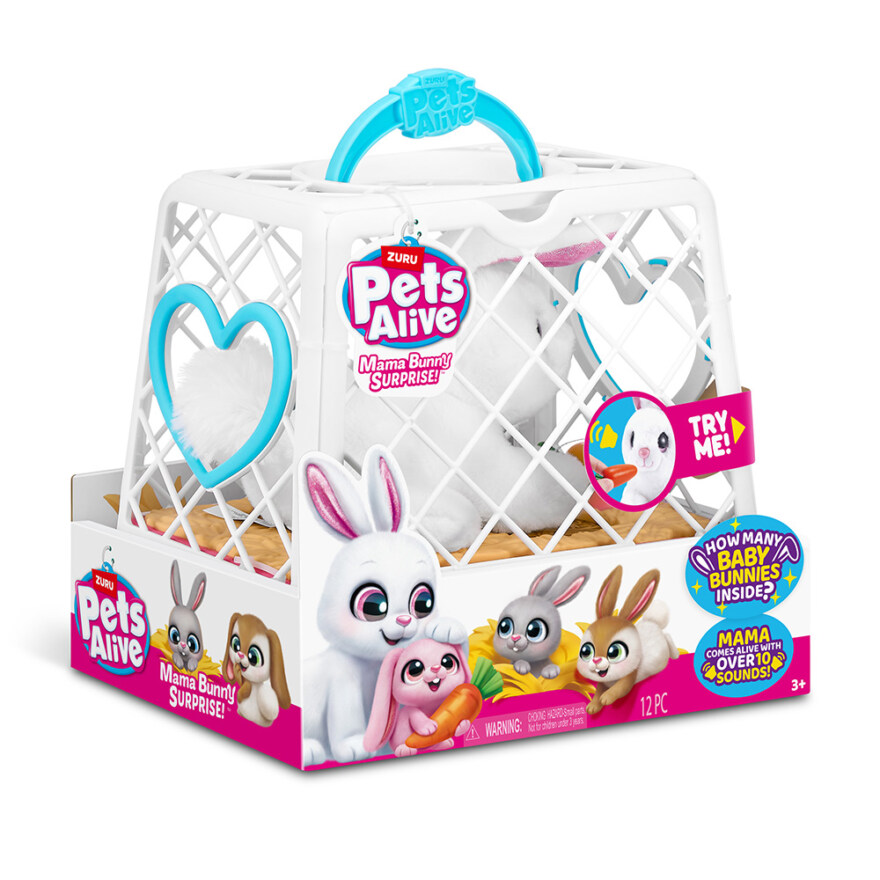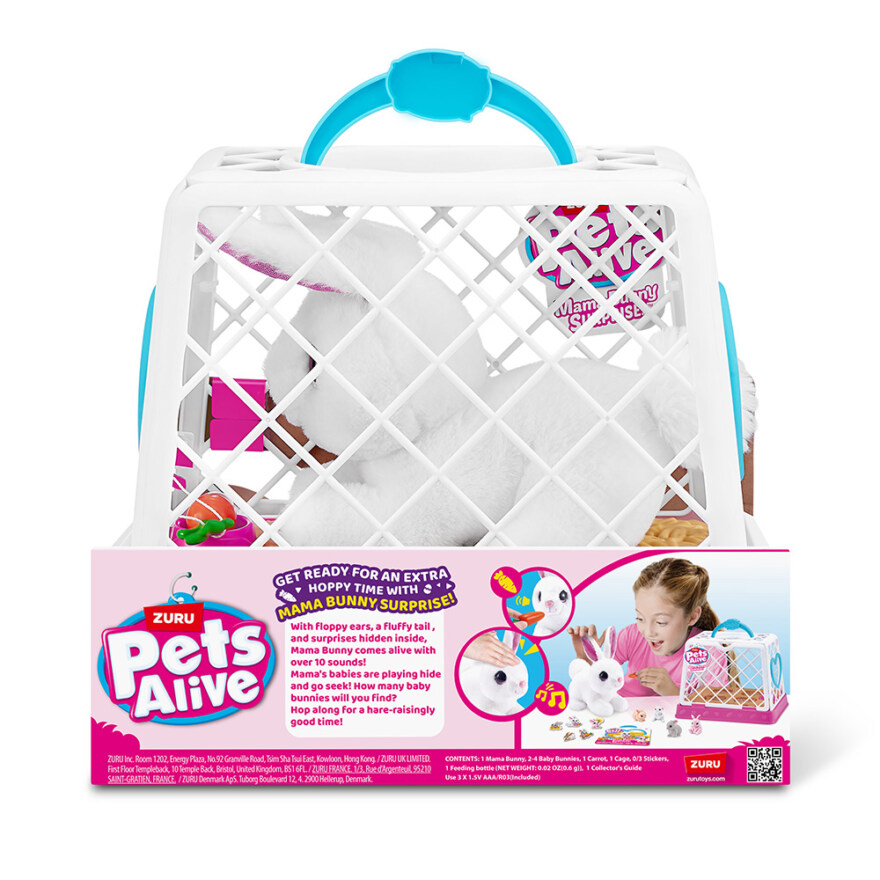 Oppdag magien med Pets Alive Mama Bunny Surprise! Denne søte kaninen gir deg en morsom og interaktiv opplevelse. Når du gir Mama Bunny en gulrot, reagerer hun og lager spiselige lyder. Men det er ikke alt – inne i buret hennes kan du finne 2, 3 eller til og med 4 små kaninunger som dukker opp som en overraskelse! Mama Bunny kommer med over 10 forskjellige lyder som gir liv til leken.