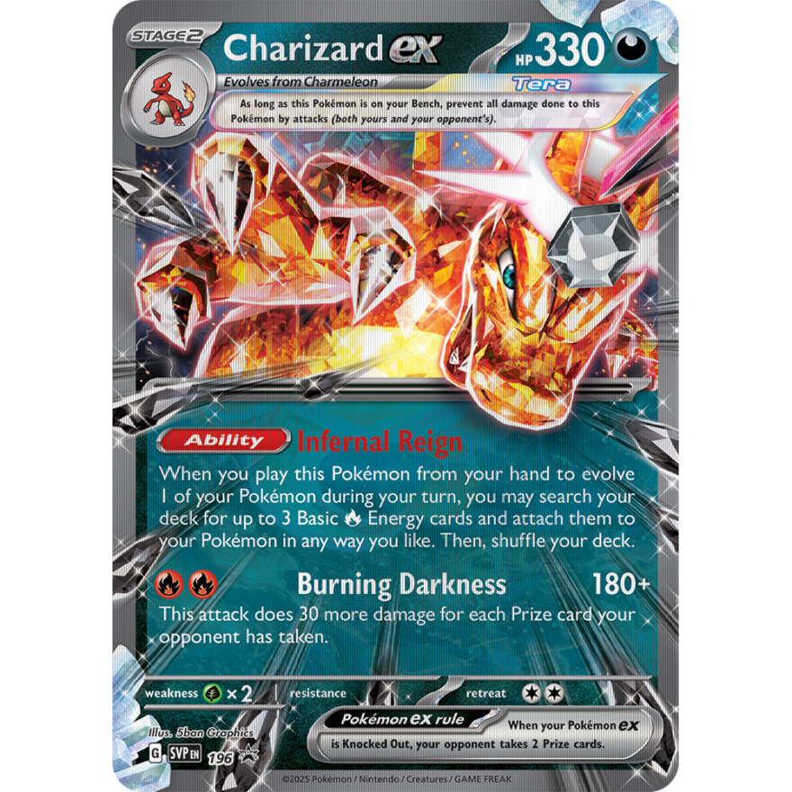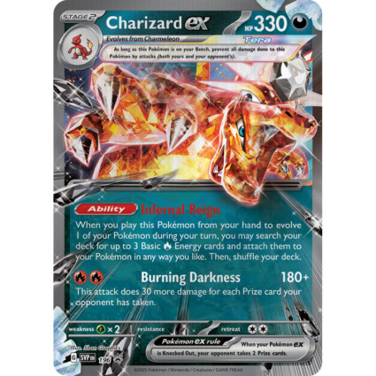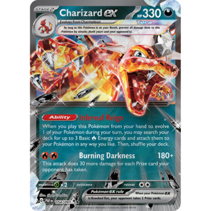 Charizard ex brenner opp motstanderens ledelse med den listige ildkraften til en Darkness-type Pokémon! Utvikle den fra Charmander og Charmeleon, og bruk dens sterke evne og angrep for å gjøre et brølende comeback. Dette ildfulle settet kommer også med 5 Pokémon TCG boosterpakker og et stort lentikulært kort som viser Flame Pokémon selv—beveg kortet frem og tilbake for å se Charizard ex gå til angrep!