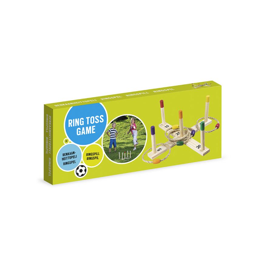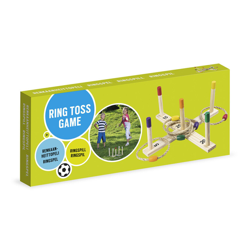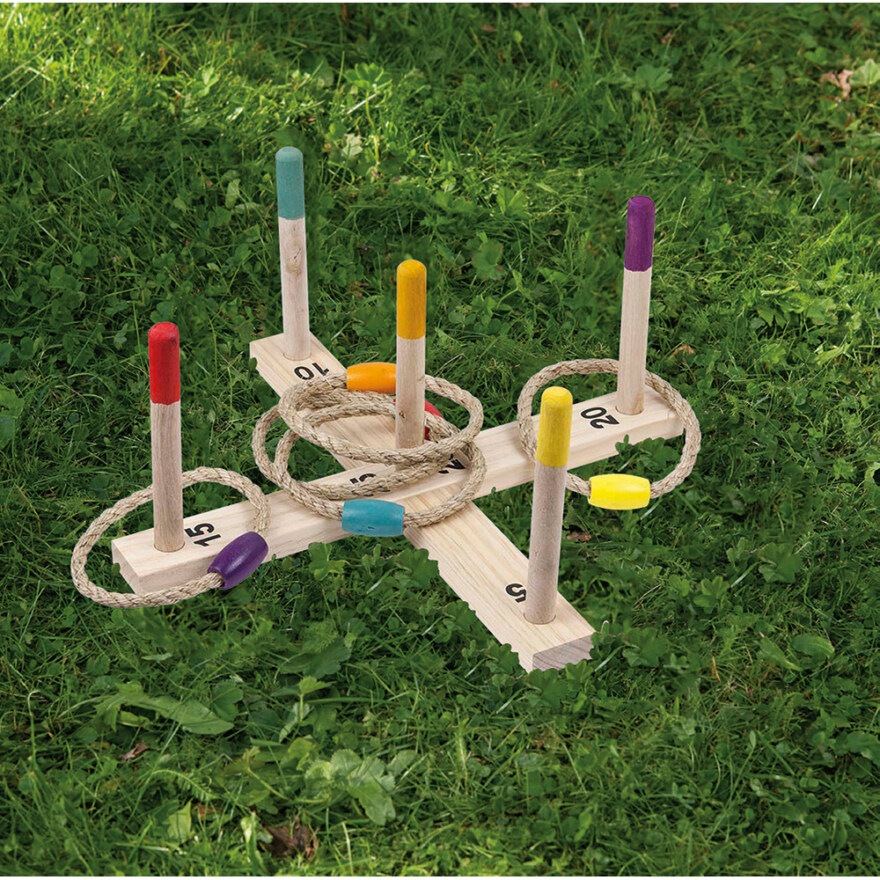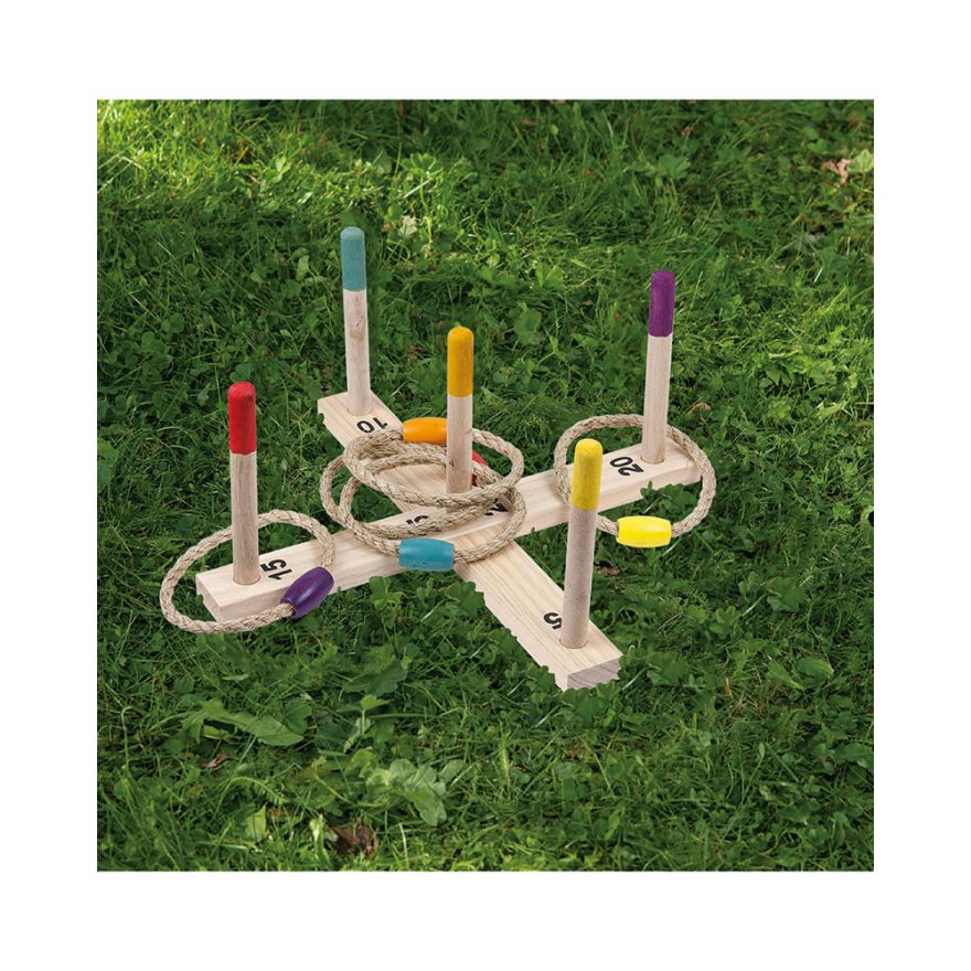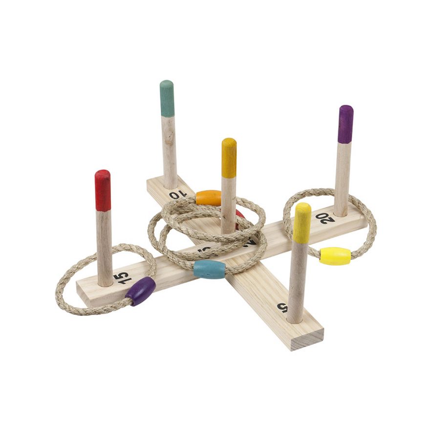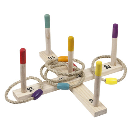 Opplev timevis med moro med ringspill, perfekt for både store og små! Dette klassiske spillet er laget i solid tre og kommer med 5 ringer, noe som gjør det ideelt for utendørs lek i hagen, på stranden eller på lekeplassen.