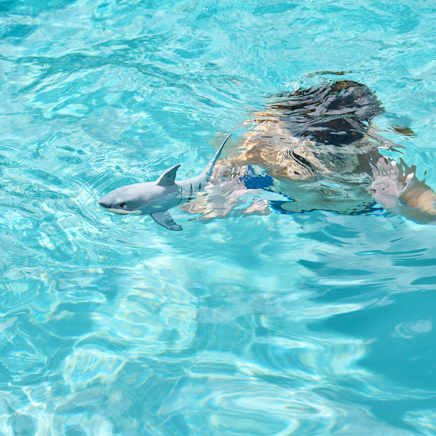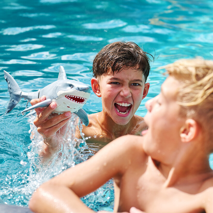 Hvithai fra Robo Alive med lysende røde øyne, den beveger seg akkurat som en ekte hai.