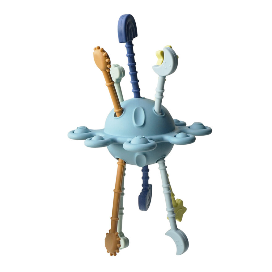 Sanseball er en myk og fargerik aktivitetsleke som stimulerer barnets sanser og motoriske utvikling. Den har en rund, fleksibel kjerne med stenger i ulike farger og former – inkludert stjerner og måner – som kan trykkes, dras og skyves frem og tilbake. De varierte teksturene gir barnet en rik sanseopplevelse, samtidig som finmotorikken styrkes. Leken er lett å gripe for små hender og laget i trygge materialer som er behagelige å ta på. Perfekt for lek både hjemme og på farten.