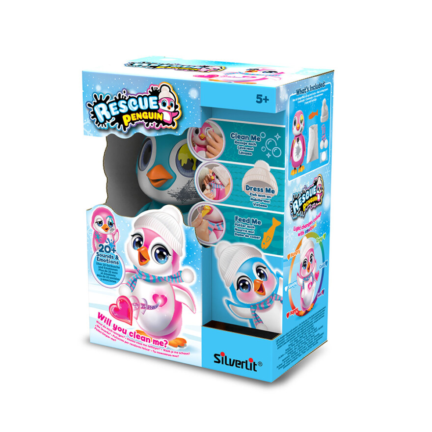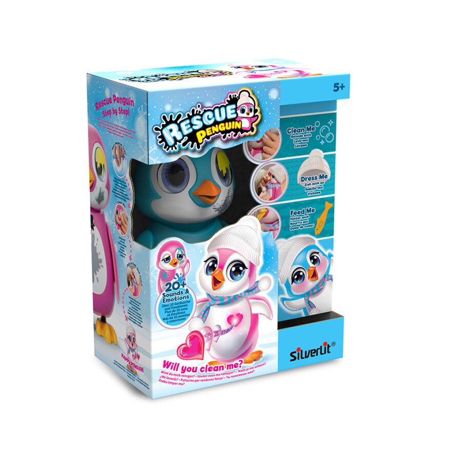 Dette er en søt interaktiv pingvin som du må ta vare på. Emballasjen tilbyr en morsom unboxing-opplevelse i tre trinn. Åpne opp boks nummer én som inneholder et magisk håndkle som utvider seg i vann. Bruk håndkleet til å tørke av pingvinen som er "skitten". Bak luke nummer to finner du et skjerf og en lue som varmer opp den skjelvende pingvinen. Når du bryr deg om pingvinen, reagerer den med lyder og bevegelser.