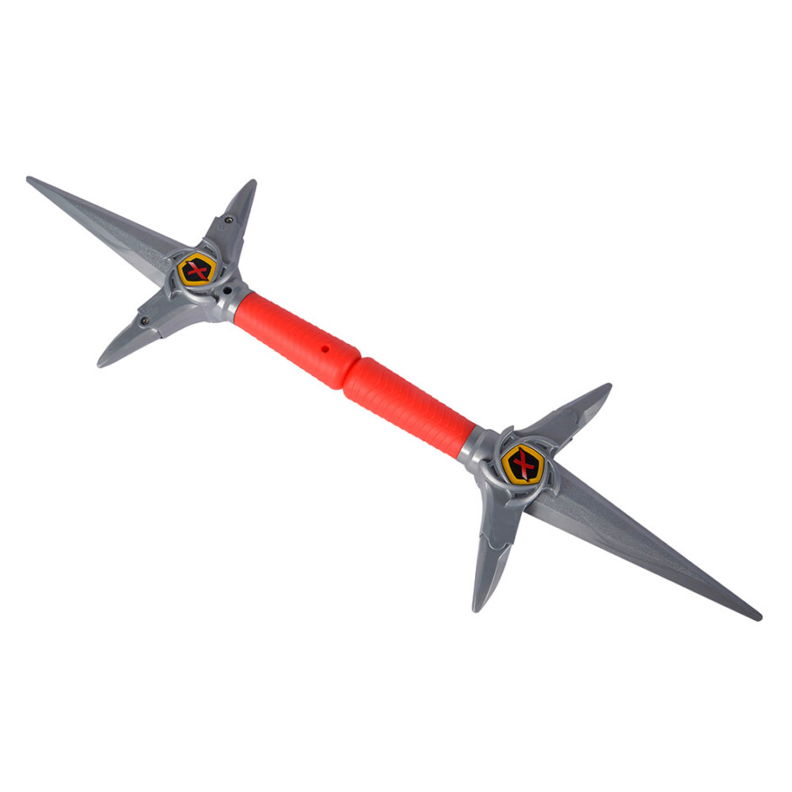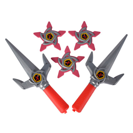 Med ninjakniven og stjernene kan du gli inn i rollen som en ekte ninja! De to knivene har en mekanisk funksjon og kan kobles sammen. Når du trykker på knappen, åpnes de sølvfargede sidepanelene over håndtaket, slik at du enkelt kan koble dem til.