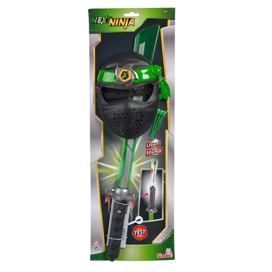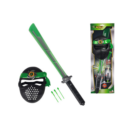 Dette settet inviterer deg til å bli en ekte ninja med sverd og maske. 60 cm sverdet har en lys- og lydfunksjon samt en skytefunksjon. Trykk på knappen på det røde håndtaket og pilene vil skytes ut. Settet inneholder også en maske som festes med en rem.