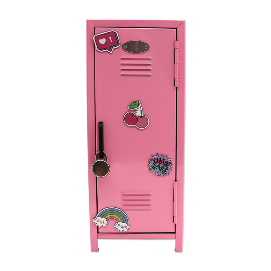 Gi smykkene dine et trygt og personlig hjem med dette smykkeskapet i klassisk "locker"-stil. Skapet kommer i rosa og inkluderer fargerike magnetmerker som lar deg dekorere og tilpasse det etter din egen stil. Inni er det god plass til smykker, små skatter og hemmeligheter, og skapet kan låses med medfølgende hengelås og nøkler. Perfekt for barn og tweens som elsker å organisere og uttrykke seg kreativt.