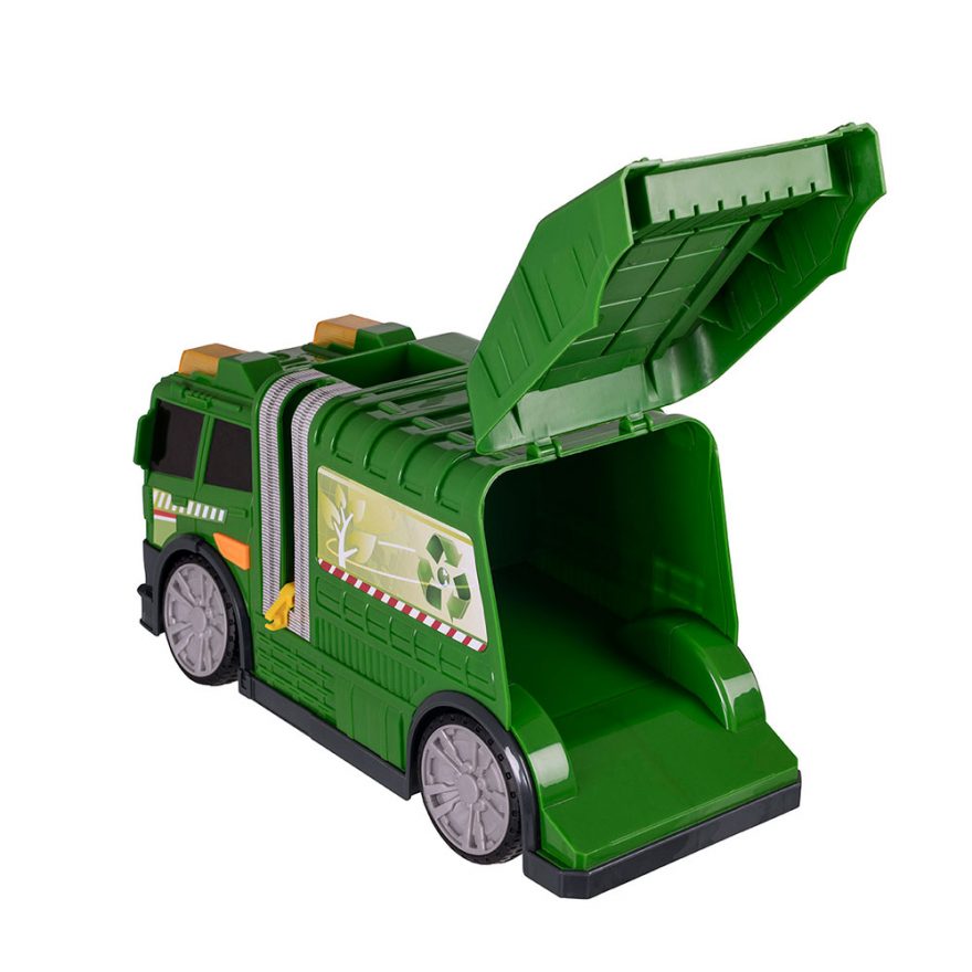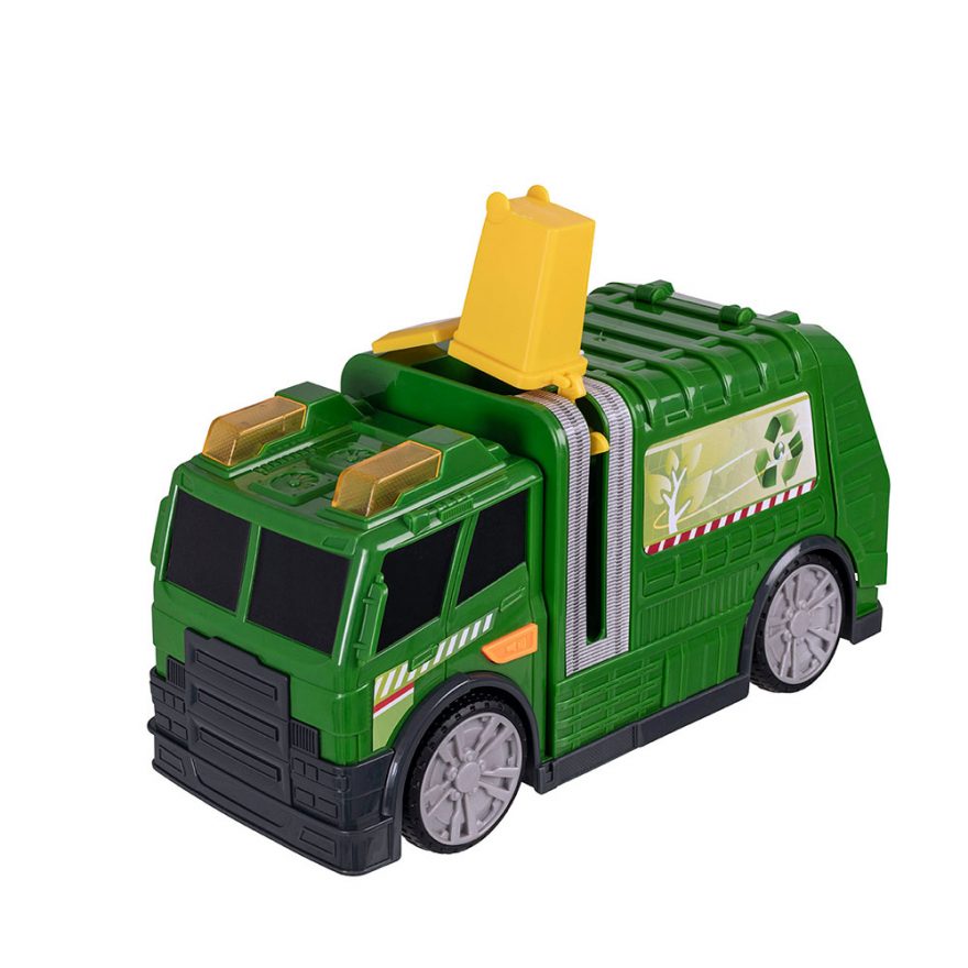 Frihjuling Lys & Lyd Resirkuleringsbil på 25 cm. Produktet har gule blinkende lys, nødsirene og søppeltømmendelyder. Manuell betjent søppelluke bak og inkluderer en hjulkasse som festes til kjøretøyet for å tømme søppelet i det øverste avfallsrommet.