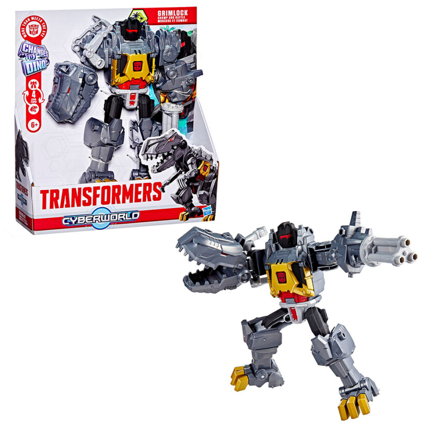 En stor og actionfylt Grimlock‑figur som byr på masse dynamisk lek. Denne 22,5 cm høye figuren forvandles fra robot til dinosaur i fire enkle trinn, og har flere bevegelige og interaktive funksjoner som gjør leken ekstra spennende. I robotmodus har Grimlock en snurrende blasterarm og en bitende dinoarm, mens brystpanelet kan åpnes for å plassere Cyber Changers‑figurer (selges separat). I dinosaurmodus får du et bitende dinohode og en hale med snurrende blaster – perfekt for kampscener og fantasifulle historier. En flott figur både for nye og erfarne Transformers‑fans.