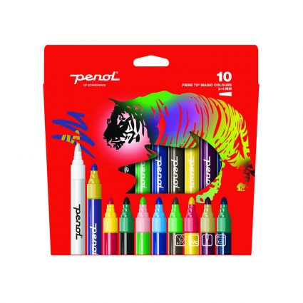 10 tusjer der den ene tusjen endrer fargen til de 9 andre. Alle barnetusjer fra Penol leveres i resirkulerbart materiale – og hylsene er helt fri for PVC. Alle tusjer er CE-merket og overholder alle krav til barnesikkerhet.