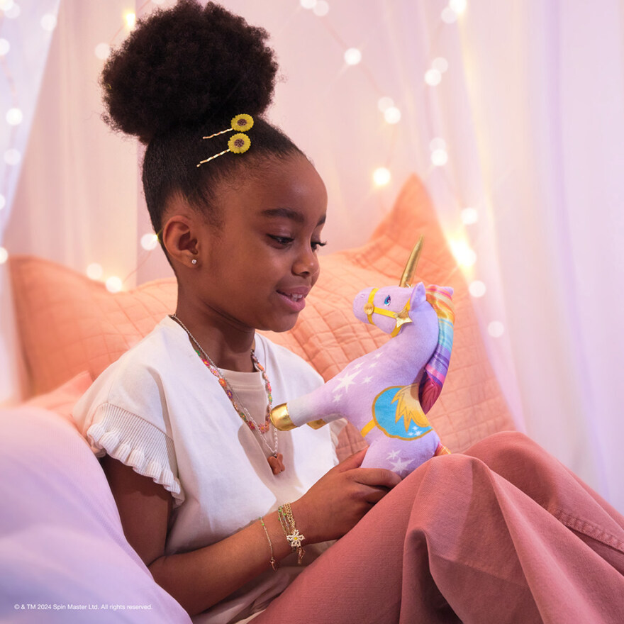 Gå inn i Unicorn Academys verden, hvor vennskap styrer! Ta med magien til spilletid og feir båndet mellom rytter og enhjørning med disse bedårende 17 cm stående plysj-enhjørningene, som fanger magien til River, Leaf og Wildstar. Hver enhjørning har autentiske karakterdetaljer fra NETFLIXs animerte show og den bestselgende serien med barnebøker, inkludert hver enhjørnings distinkte magiske markeringer og farger.