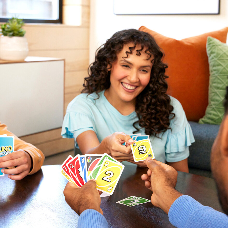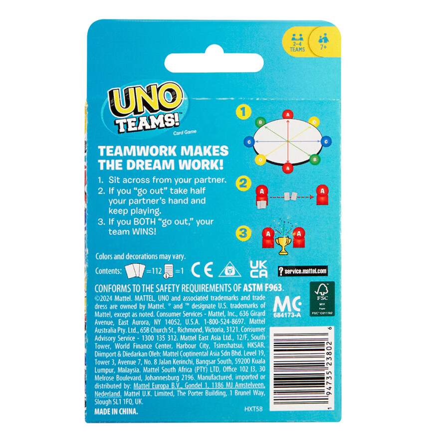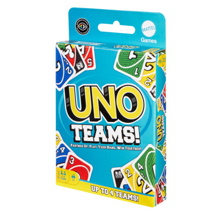UNO Teams er en ny og spennende måte å spille det klassiske spillet på! Spillere matcher fortsatt farge, nummer og symbol, men i stedet for å spille alene, danner de lag på to og spiller sammen for å vinne. Spesialkort og regler hjelper lagkamerater å samarbeide, men begge spillerne må kvitte seg med alle kortene i hånden for å vinne. Og husk, når du (eller partneren din!) har ett kort igjen, ikke glem å rope "UNO!".