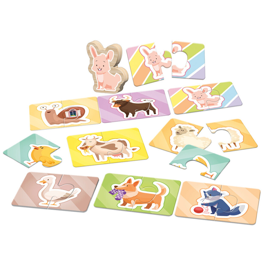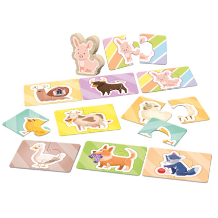 Finn delene for å lage alle dyrene! Del de to forskjellige typene deler på bordet, stokk dem og ta tur for å finne de to delene av hvert dyr. Hver gang du finner en kanin, hopper kaninfiguren i tre til deg – og hjelper deg kanskje med å vinne!