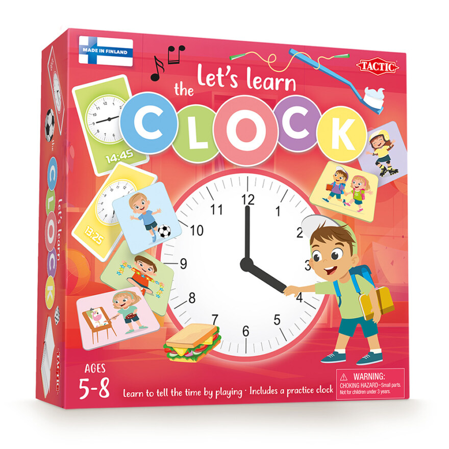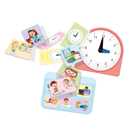 Lær klokka! Finn de riktige bildene for brettet ditt og drei klokkeviserne til riktig posisjon for å matche klokkeslettene på kortene!