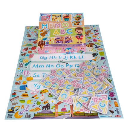 Fargerike brikker inviterer barna til å lære seg bokstaver og hva ting heter. Inkluderer en ABC-poster og veiledning til foreldrene.