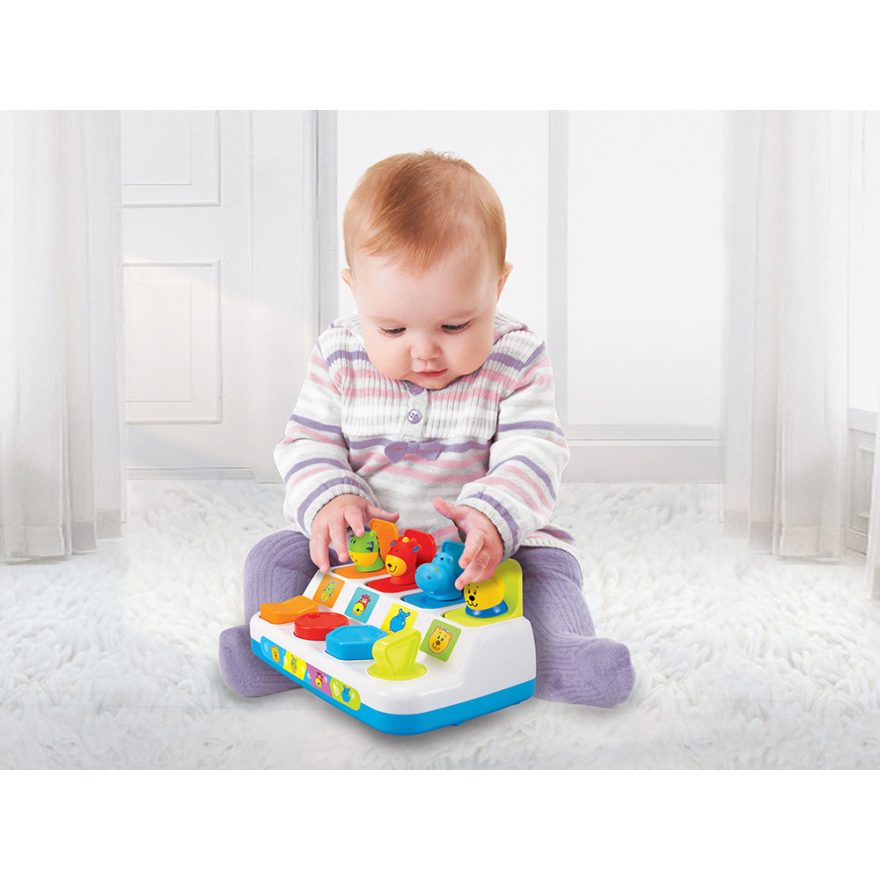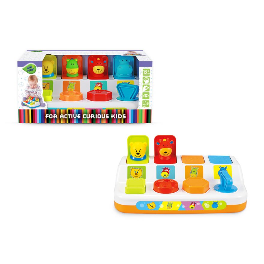 Aktivitetsleke med dyr som popper opp når man trykker eller vrir på en av knappene.
