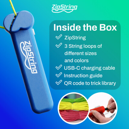 ZipString, den originale versjonen, gjør det mulig å utføre imponerende triks med en flyvende snor som svever ved hjelp av fart, luftmotstand og perfekt balanse. Enheten sender snoren av gårde i høy hastighet, og med tre forskjellige snorlengder i ulike farger kan barn og voksne prøve alt fra ferdiglagde triks til å finne opp egne. ZipString lades enkelt med USB og leveres klar for timesvis med utfordring og moro.