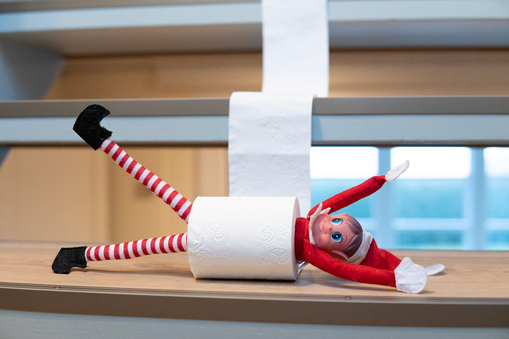 Tjo-hei hvor det går! Rampenissen ruller ned trappa inni dorullen, for en fornøyelse!
