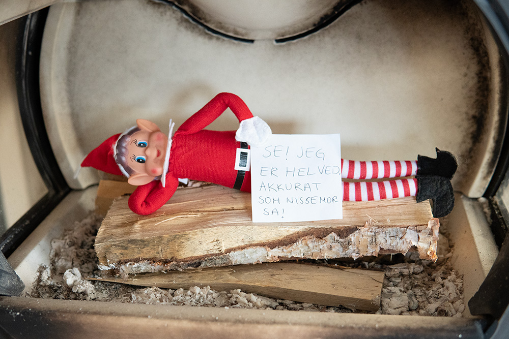 Rampenissen har lagt seg inni peisen sammen med de andre vedkubbene, for nissemor sa en gang at han er hel ved.